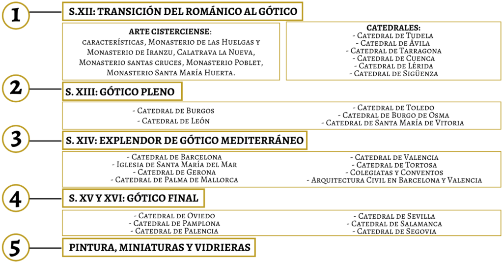 Iniciamos el estudio del arte Gótico en todas sus facetas y países, comenzando este monográfico con un enfoque en la arquitectura y escultura del Gótico español. Partiremos desde sus orígenes, explorando la transición del románico del siglo XII hacia el arte cisterciense, para luego adentrarnos en el gótico pleno del siglo XIII. Continuaremos con el gótico mediterráneo del siglo XIV y culminaremos con el Gótico final de los siglos XV y XVI. Cada uno de estos periodos será analizado a través del estudio detallado de sus catedrales más representativas, proporcionando una comprensión profunda de la evolución del arte Gótico en España.
