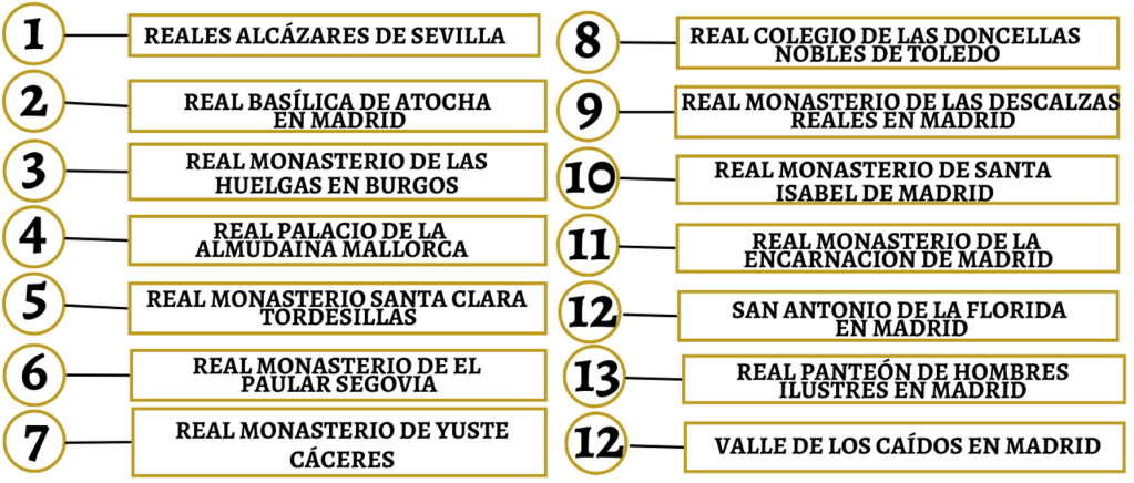 Para completar nuestro estudio sobre los edificios que forman parte del Patrimonio Nacional, es necesario ampliar nuestro análisis de los grandes palacios con otros 14 emblemáticos monumentos. Estos incluyen los Reales Alcázares, la Basílica de Atocha, Las Huelgas de Burgos, la Almudaina de Mallorca, el Monasterio de Santa Clara en Tordesillas, el Monasterio de El Parral en Segovia, el Monasterio de Yuste en Cáceres, el Colegio de Doncellas Nobles en Toledo, el Monasterio de las Descalzas Reales, el Convento de Santa Isabel en Madrid, el Monasterio de la Encarnación, la Ermita de San Antonio de la Florida, el Panteón de Hombres Ilustres y, para finalizar, el Valle de los Caídos. Este recorrido nos permitirá conocer a fondo la riqueza histórica, cultural y arquitectónica de estos monumentos, que son parte fundamental del legado de España.
