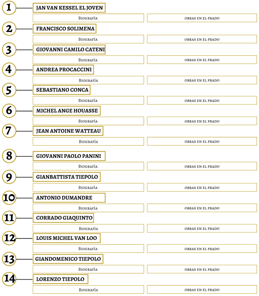 El siglo XVIII, a menudo pasado por alto en el Museo del Prado, ofrece una valiosa oportunidad para redescubrir a grandes artistas y sus notables obras. Comenzaremos nuestro estudio con un enfoque en Europa, analizando tanto a los artistas italianos como a los franceses que formaron parte de la corte durante este periodo de cambio dinástico. Entre los nombres destacados se encuentran Van Kessel, Francesco Solimena, Benedetto Cateni, Giulio Cesare Procaccini, Sebastiano Conca, Charles de La Fosse, Antoine Watteau, Giovanni Paolo Panini, Giambattista Tiepolo, Jean Dumont le Romain, Corrado Giaquinto, Carle Van Loo, y los hermanos Giandomenico y Lorenzo Tiepolo, sin olvidar al influyente Anton Raphael Mengs. Este recorrido nos permitirá apreciar la riqueza artística del siglo XVIII y su relevancia en la Historia del Arte europeo.